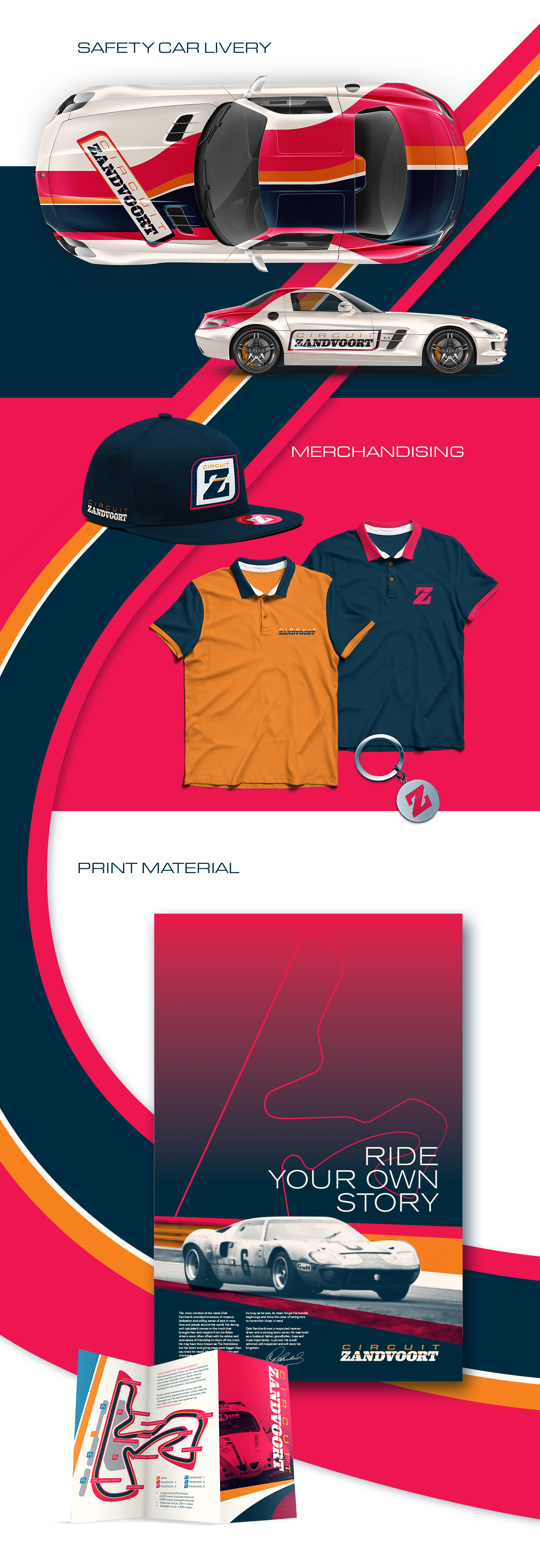 The colours represent the the tarmac and rubber in the dark blue. The orange hints at the Dutch heritage (fun fact: the circuit's owner is actual royalty) but also the beach that the main straight of the track runs parallel to. And the magenta red adds the excitement of a day at the races.